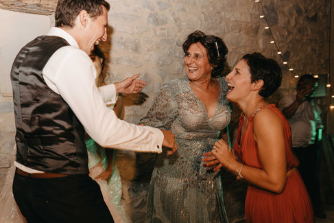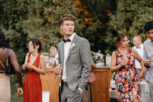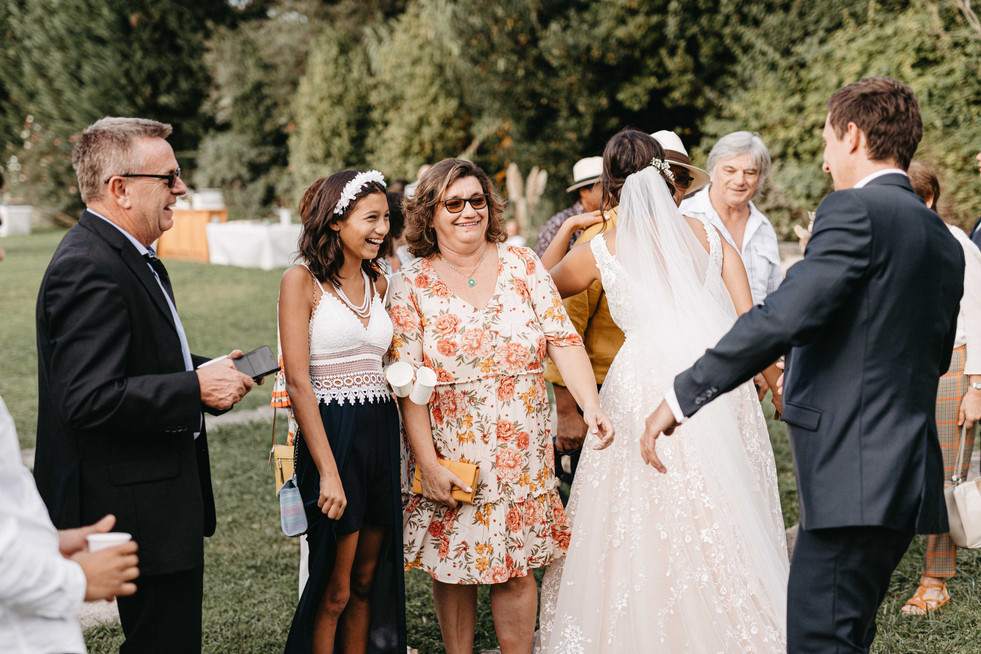 Enfin, les mariés étaient libérés de nous 😁j'ai donc pu déambuler pendant le cocktail, laisser Laura et Samuel manger et boire tranquillement et faire des photos volées (et posées aussi, pour le plaisir) des invités ou des photos de groupes un peu plus spontanées qui n'avaient pas été faites jusqu'à maintenant. J'aime fonctionner de cette manière plutôt que faire une longue session de deux heures et empêcher les mariés de profiter de leur cocktail ! C'est beaucoup trop lourd dans une organisation et une journée de mariage qui passe déjà à la vitesse de la lumière. Nous avons donc profité, lancé le bouquet dans la joie de l'heureuse élue (et de son compagnon aussi, pour une fois qu'il ne s'échappe pas 😁), puis nous avons eu droit aux discours très émouvant des différents témoins, les mariés n'étaient pas les seuls à finir en larmes ! C'est aussi ce que j'ai adoré dans le mariage de Laura et Samuel, cet amour partout, ces amitiés de longues dates qui ont supporté toutes les épreuves de la vie et du temps. Je voyais de l'affection et de la bienveillance partout, des private jokes à tout va, des câlins infinis, une recette parfaite pour une ambiance inoubliable. Tout ça au rythme de la musique gérée par Vax Populi et son superbe Bar à Vinyles qui a fait sensation auprès des invités ! (Si vous êtes attentifs, vous verrez une tête familière dans les photos :D)