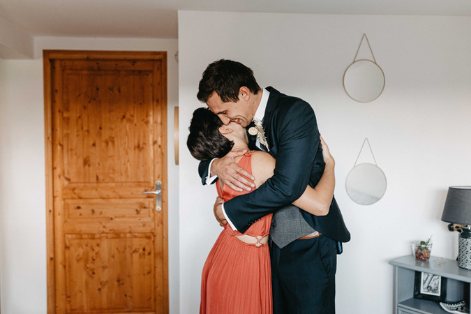 Ils sont partis ensuite en direction de l'Eglise, laissant le champs libre à Laura pour se préparer et enfiler sa robe sans risquer d'être vue. Maquillée par sa cousine, je l'admirais d'un oeil discret dans sa beauté naturelle, élégante, sans artifices. Pendant les mariages, j'aime beaucoup les préparatifs parce que ce sont des moments doux, tranquilles, le calme avant la tempête, mais il y'a toujours un mouvement de petite panique et d'adrénaline lorsqu'il faut partir, on a peur d'être en retard, d'oublier quelque chose, qui monte dans quelle voiture, etc...J'essaie toujours de prévenir les mariés que c'est normal, que ça arrive quasiment systématiquement même aux plus zens, et qu'il faut toujours essayer d'être dans le lâcher prise, se laisser porter par la vague. Pour ma Laura ça n'a peut-être pas été le moment le plus simple ni le plus agréable de sa journée, et étant sensible moi-même je ne pouvais que compatir, mais heureusement pour elle, le stress et la montée en tension n'ont pas duré éternellement et nous avons quand même pu faire une jolie découverte avec son papa, tout aussi ému ❤️