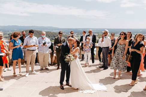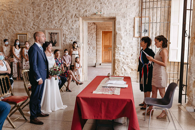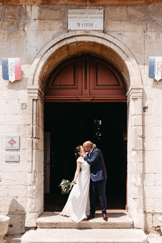 C'est sans fanfare, ni voiture de luxe, ni cortège, que les amoureux sont arrivés dans les jolies ruelles d'Eguilles pour rejoindre la mairie à pieds et retrouver tous leurs proches afin d'enfin officialiser leur union ! La cérémonie civile s'est déroulée dans la joie, les larmes de Fabrice et celles de Leslie, le texte de loi lu par Camille la fille de Fabrice, puis nous sommes sortis pour acclamer les jeunes mariés et en profiter pour les félicitations, les embrassades et le bonheur d'être tous ensemble.