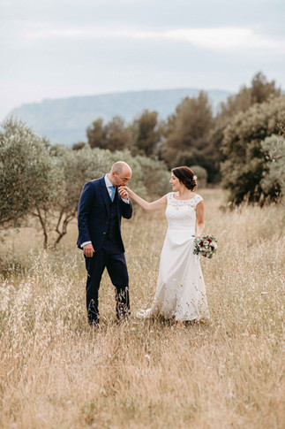 Après toutes ces belles émotions, nous sommes remonté près de la piscine et des grands espaces pour profiter du vin d'honneur et commencer à faire la fête comme il se doit ! L'ambiance était calme, reposante, tout le monde profitait simplement de ce moment, de cet endroit incroyable et des prestations de qualité qu'il propose, une véritable pause dans le paradis Provençal. Après avoir laissé les mariés profiter de leurs proches et du cocktail, je les ai accaparés pour faire leur fameuse session de couple en toute intimité. Malheureusement, le ciel s'était voilé entre temps et nous n'avons pas eu droit à la Golden Hour que j'aime tant, mais j'ai joué avec la lumière des herbes folles, la couleur claire des oliviers et surtout les reliefs de la Ste Victoire et du Mont Aurélien, tout en mettant l'accent sur la tendresse légendaire de ces deux amoureux.