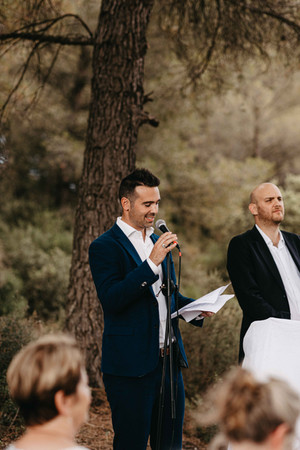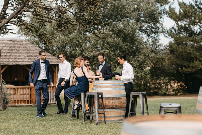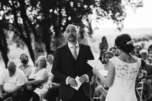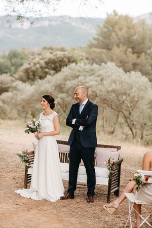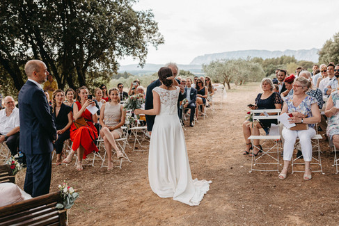 Nous avons ensuit rejoint le Domaine à nouveau (je vous avoue, on s'est endormis sur le trajet dans la voiture avec Leslie et Fabrice, après l'émotion tout ça 😂) En attendant que tout le monde arrive sur place pour la cérémonie laïque, j'ai fait quelque photo du domaine, de la décoration, et vous remarquerez les petits détails des objets gravés, ils ont été créés par le papa de Leslie pour l'occasion ! Nous avons pris un petit rafraichissement à base de citronnade géré par le traiteur du jour, Le Romarin Vert et nous en avons profité pour faire quelques photos de famille avant la cérémonie. Pour celle-ci, elle se déroulait un peu en contrebas du domaine, au milieu de la végétation et surtout devant une merveilleuse vue sur le Mont Aurélien. Vous reconnaitrez tous aussi la fameuse Ste Victoire en toile de fond pour le cortège d'honneur ! La cérémonie a été émouvante au possible, tout le monde pleurait (y compris moi), beaucoup de surprises, de chansons dont une déclaration d'amour chantée par Leslie, de beaux discours, des cadeaux humoristiques de Leslie pour Fabrice et vice-versa, bref, un moment chaleureux et inoubliable !